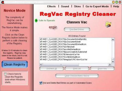 RegVac Registry Cleaner là trình dọn dẹp registry gồm nhiều công cụ để dọn Registry khỏi những mục không cần thiết. Bộ tiện ích này dọn sạch registry, danh sách đã duyệt, danh sách các file truy cập gần đây và một số mẹo. Nó cũng xóa trong 27 loại rác phổ biến nhất và cho phép bạn thêm vào địa chỉ khác để dọn. Nó tìm các khóa và danh sách file còn lại còn lại sau khi xóa file, và xóa chúng. Bạn cũng có thể cài/tháo gỡ chương trình, và nó bao gồm một tiện ích cấu hình hệ thống.