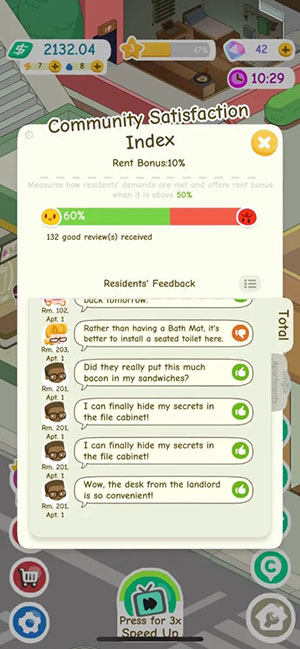Từ phần đánh giá (nút trông giống như biểu tượng cảm xúc nhắm mắt), game thủ có thể biết nhu cầu của người thuê nhà và những vấn đề họ đang gặp phải trong cộng đồng. Vì vậy, mọi người sẽ phải nâng cấp các dịch vụ hoặc nâng cấp phòng cho họ.