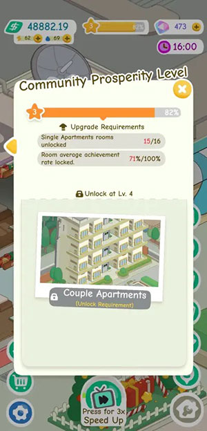 Yếu tố quyết định cuối cùng cho sự tiến bộ trong Rent Please! - Landlord Sim là cấp độ thịnh vượng cộng đồng của người chơi. Điều này được biểu thị bằng ngôi sao ở đầu màn hình và thanh bên cạnh nó, cho biết cụ thể hơn khoảng cách để đạt đến cấp độ tiếp theo.