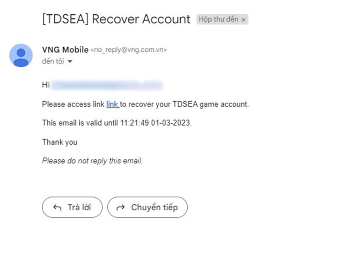 Bước 3: Kiểm tra email của hệ thống gửi tới hộp thư điện tử của mình. Trong mail sẽ đính kèm một đường link để game thủ đổi mật khẩu mới.
