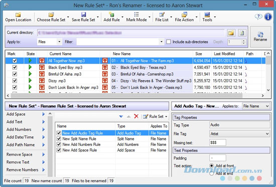 - Sử dụng 15 quy tắc đổi tên: "Thêm không gian", "Thêm văn bản", "Thêm số", "Ngày/Giờ", "Tên đường dẫn", "loại bỏ không gian", "Hủy bỏ văn bản", "Hủy bỏ số", "Thêm Tag Music", "Thêm thẻ Image", "Change Case", "Thay ngày, giờ", "Thay thế văn bản", "Thay thế số", "Split Name".