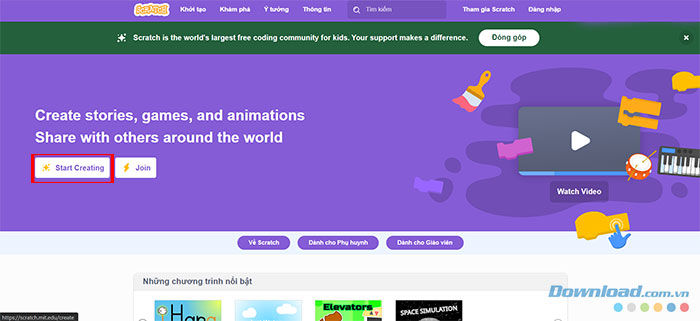 Mọi người có thể tạo trò chơi Ball Bounce mà không cần đến tài khoản Scratch. Chỉ cần nhấp vào tab Start creating ở đầu trang chủ và trong vài giây, mọi người sẽ được điều hướng tới giao diện lập trình.