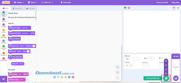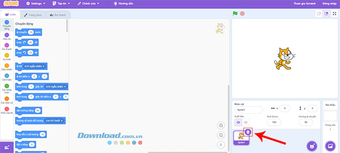 Ở dự án này, mọi người sẽ không dùng Sprite mặc định, vì vậy hãy nhấn vào biểu tượng thùng rác ở bên phải Sprite và bên dưới khung vẽ để loại bỏ con mèo.
