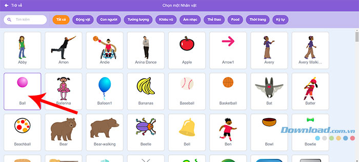 Tiếp theo, nhấn vào biểu tượng con mèo để Chọn một nhân vật, sau đó chọn quả bóng (Ball) đầu tiên.