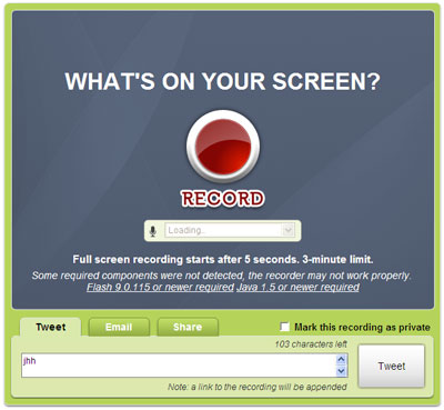 Đầu tiên các bạn truy cập tới địa chỉ Screenjelly. Sau đó, Screenjelly sẽ tự động nhận dạng dạng microphone bạn đang dùng cho việc thu âm trên hệ thống. Như nói trên, để bắt đầu thu một video các bạn chỉ cần nhấp button Record màu đỏ, tiến trình ghi toàn màn hình sẽ bắt đầu sau 5 giây khi Screenjelly load đủ công cụ liên quan phục vụ cho đoạn video chuẩn bị ghi.