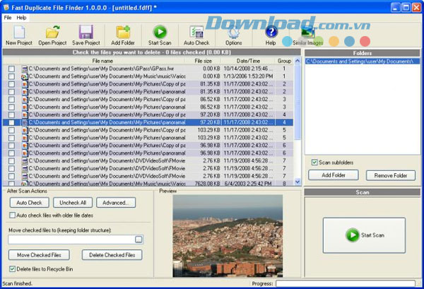 Tải xong, giải nén và kích hoạt tập tin Search Duplicate Files.exe để vào giao diện của chương trình. Để bắt đầu tìm kiếm, trong mục Search Engines bạn hãy chọn cho mình một kiểu tìm kiếm thích hợp như: File name (tìm kiếm theo tên tập tin), File name and size (tìm kiếm theo tên và kích thước tập tin), File contents (tìm kiếm theo nội dung). Sau đó, bạn vào menu File, chọn Scan (F5), trong hộp thoại tìm kiếm ổ đĩa hãy chọn cho mình một phân vùng mà bạn muốn tìm kiếm, nhấn OK để chấp nhận. Chương trình sẽ phân tích, kiểm tra rồi đưa ra cho bạn một danh sách chi tiết các tập tin trùng lặp có trên phân vùng mà bạn đã chọn bao gồm: tên tập tin, kích thước, địa chỉ... Lúc này công việc của bạn là quyết định có nên giữ hoặc xóa các tập tin trùng lặp kia hay không.