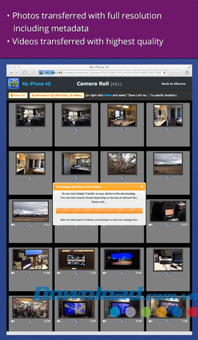 Simple Photo & Video Transfer là công cụ đơn giản nhất để chuyển ảnh và video cá nhân của bạn vào máy tính PC hoặc các thiết bị iOS khác thông qua kết nối không dây WiFi. Với Simple Photo & Video Transfer, bạn không cần đến cáp truyền dữ liệu, iTunes hay bất kỳ phần mềm mở rộng nào khác.