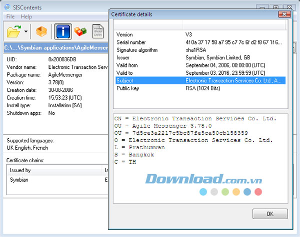 Nhưng với SISContents bạn có thể hoàn toàn mở và chỉnh sửa file SIS mà không cần bung file SIS đó ra, do vậy không cần quan tâm đến việc đóng gói sau khi đã chỉnh sửa. SISContents hỗ trợ file SIS các dòng máy Nokia S60 3rd, 5th Edition and Sony Ericsson UIQ 3.