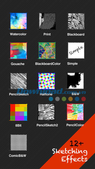 Sketch Guru hỗ trợ cả hiệu ứng tranh vẽ đen trắng và màu sắc rực rỡ với 13 loại hiệu ứng độc đáo như Gouache, PencilSketch, ColorPencil, WaterColor, HalfTone, SimpleSketch, ComicB&W, BlackBoard, BlackBoardColor, Print, B&W, PencilSketch2 và No sketch.
