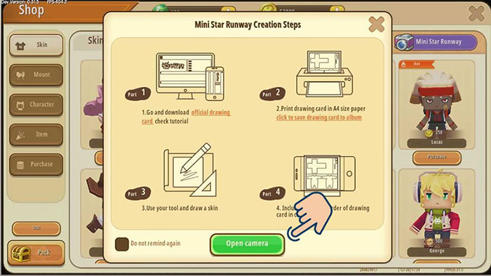 Trên màn hình chính, chọn Shop > Skin > Mini Star Runway > Open Camera > Paint trên Drawing card > Chụp ảnh Drawing card > Phối hợp nhân vật > Sử dụng DIY Skin.