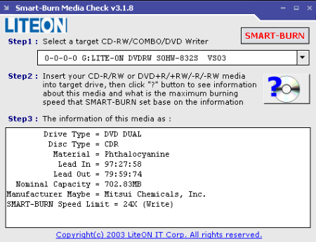 SMART-BURN Media Check là phần mềm miễn phí của hãng LiteOn - một tên tuổi trong làng sản xuất ổ CD/DVD ngày nay, SBMC mang đến cho bạn công cụ kiểm tra đĩa mạnh mẽ và chính xác. Với chương trình, bạn sẽ được thông báo một cách chi tiết tình trạng tốt xấu và tốc độ ghi thực sự của đĩa nhằm giúp bạn chọn lựa xem có đúng với tốc độ ghi bên ngoài nhãn đĩa hay không, tránh tình trạng đang ghi dữ liệu thì bị rớt đĩa – đây là một trong những nguyên nhân thường gặp ở những đĩa kém chất lượng. Nhờ thế mà bạn có thể yên tâm sử dụng đĩa để ghi những dữ liệu quan trọng nhằm tránh những hỏng hóc sau này.