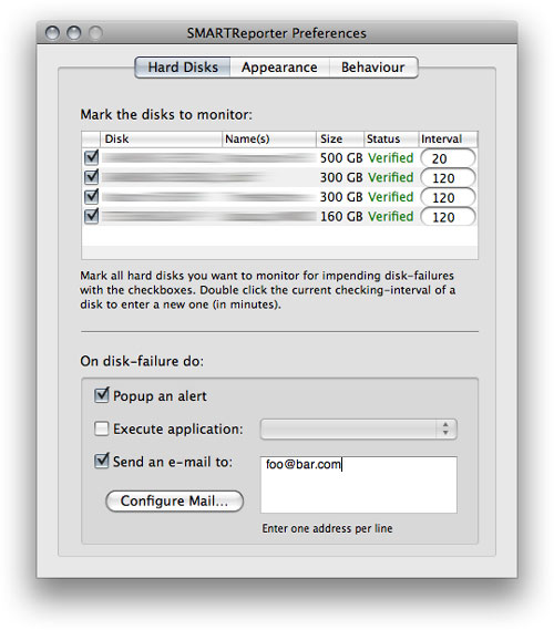 SMARTReporter là một ứng dụng giúp cảnh báo bạn một số đĩa cứng có thể hỏng trước khi sự việc xảy ra. Chương trình này sẽ kiểm tra định kì tình trạng S.M.A.R.T – công nghệ tự quản lý phân tích và báo cáo - ổ cứng của bạn. S.M.A.R.T. là công nghệ hoạt động như một hệ thống cảnh báo sớm cho dành cho các ổ cứng. SMARTReporter có khả năng thông báo cho bạn các lỗi ổ cứng có thể xảy ra bằng cách gửi email, hiển thị thông báo hoặc chạy một ứng dụng. Tình trạng hiện tại của ổ đĩa luôn được hiển thị thông qua một menu mục tin có thể tùy biến được. Bởi SMARTReporter dựa vào khả năng thực thi S.M.A.R.T. của Mac OS X, chương trình này chỉ hỗ trợ ổ đĩa ATA, SATA hoặc eSATA. Tuy nhiên, hãy chú ý rằng thông báo của S.M.A.R.T. không có nghĩa rằng ổ cứng của bạn hoàn toàn lỗi hay S.M.A.R.T. có khả năng bắt toàn bộ lỗi của ổ cứng, đây chỉ là một chỉ dẫn giá trị.