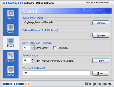 Sau khi hoàn tất quá trình cài đặt, bạn hãy khởi động chương trình lên. Một icon hình chữ S sẽ xuất hiện ở vùng taskbar, nhấp đúp chuột vào đấy thì giao diện chính của StealthDisk mới xuất hiện. Nhìn sang bên trái, bạn sẽ thấy được 4 icon chính.
