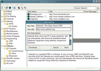 Là dân “lục lọi” web, bạn thường lưu lại địa chỉ mỗi khi bắt gặp một trang web hấp dẫn. Để làm việc này, bạn hay sử dụng trình đơn Bookmarks/Favorites của trình duyệt khiến cho chúng nhanh chóng trở nên nặng nề. StorURL 2.5 sẽ giúp bạn giải quyết vấn đề vì nó là một tiện ích nhỏ gọn cho phép lưu trữ mọi địa chỉ trang web yêu thích cùng tiêu đề với phần mô tả. Chương trình này cung cấp cho bạn khả năng quản lý các địa chỉ web một cách ngăn nắp trong một giao diện đơn giản.