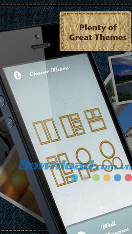 - Chọn từ 76 bố cục ảnh tùy chỉnh, 7 theme (cổ điển, hoạt hình, Facebook, phim, Honeycomb, Polaroid, Wall of Frames)
