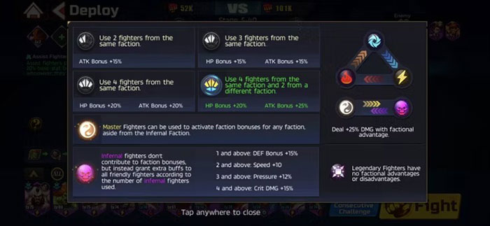Nếu xây dựng đội của mình đúng cách, người chơi sẽ không chỉ mạnh hơn trước các đội thuộc phe đối lập mà còn nhận được một số buff tuyệt vời. Đặt mục tiêu chia tỷ lệ 4-2 giữa 3 phe cơ bản, sử dụng Master để giúp đạt được bonus và tăng cường các vị trí hỗ trợ bằng Infernal.