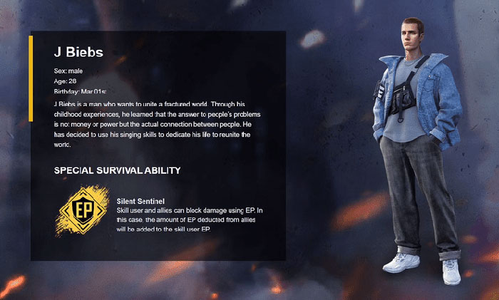Kỹ năng bị động của Justin Bieber tên là Silent Sentinel. Nó cho phép tất cả các nhân vật trong khu vực 12 mét xung quanh người chơi có thể chặn tới 15% sát thương sắp tới bằng EP của họ. EP bị trừ từ các đồng minh sẽ được thêm vào nhóm EP của người chơi.