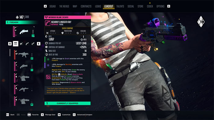 Phương pháp build Harley Quinn này hoạt động tốt nhất với vũ khí tầm gần và tầm trung, đặc biệt là súng lục và SMG. Một trong những thứ hay nhất là Bizarro’s Undeath Ray, một khẩu súng lục khét tiếng. Bizarro’s Undeath Ray tấn công kẻ thù bằng Craze Affliction bất cứ khi nào ghi được một đòn chí mạng và nó cũng gây thêm sát thương cho kẻ thù Crazed.