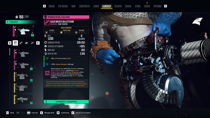 Black Mask’s Bulletstorm là một vũ khí hạng nặng tuyệt vời dành cho King Shark vì việc nhắm vào nhiều kẻ thù trong một khoảng thời gian ngắn rất dễ dàng nhờ tốc độ bắn chóng mặt của vũ khí. Ít nhất cho đến khi Joker xuất hiện trong phần một, Bulletstorm sẽ vẫn là lựa chọn hàng đầu.