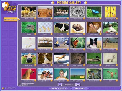 Những chú chó ngộ nghĩnh, những con mèo dễ thương và nhiều động vật khác nữa, dĩ nhiên những con vật gắn bó với cuộc sống của chúng ta, sẽ được thể hiện qua những tấm ghép ngộ nghĩnh, hãy thư giãn với những tấm gép này nhé, Hơn 50 bức ảnh, bạn tha hồ lựa.....Bạn đóng vai trò lạ người chơi, đầu tiên, một tấm hình sẽ bị tách ra nhiều mảnh, bạn phải ghép sao cho khớp với nhau và nhanh nhé. Nếu bạn là người mới biết chơi thì hãy chọn easy và ghép vài mảnh thành tấm hình thôi ...còn nếu đã chơi rành rọt thì chọn chơi tính thời gian, cái đó khó đấy, cố gắng nhé để có những tấm hình những con vật ngộ nghĩnh,