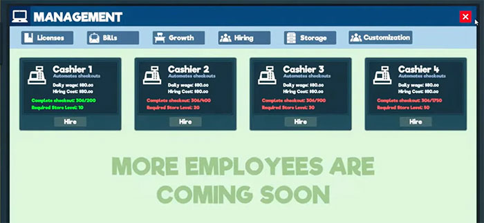 Khi phát triển cửa hàng tạp hóa của riêng mình, người chơi sẽ có cơ hội thuê nhân viên thu ngân trong Supermarket Simulator để hỗ trợ công việc thanh toán với khách hàng. Tuy nhiên, khi doanh nghiệp của mọi người mở rộng, việc quản lý các nhiệm vụ khác như nhập kho, sắp xếp sản phẩm,... ngày càng trở nên khó khăn.