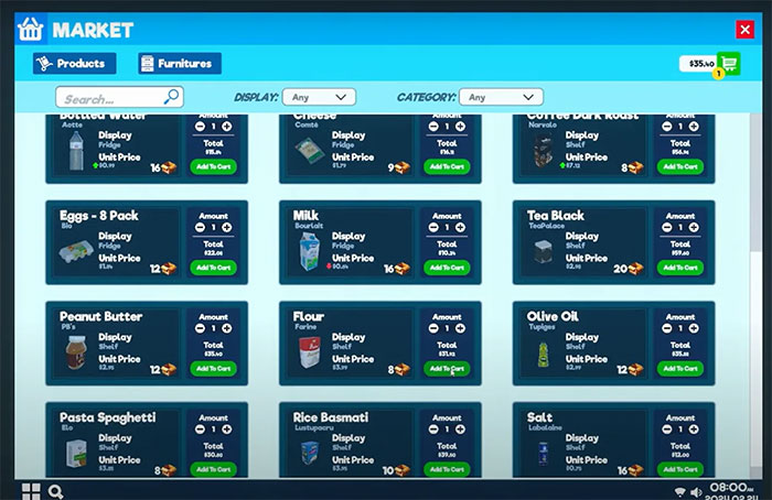 Việc nhập nhiều loại mặt hàng sẽ cho phép game thủ theo dõi hàng tồn kho của mình, luôn có các sản phẩm bổ sung cần thiết cho ca làm việc trong ngày và nhanh chóng bổ sung hàng hóa thay vì chờ đơn hàng mới. Sau này, mọi người cũng có thể thêm các kệ để giúp mình sắp xếp tài nguyên và dễ dàng theo dõi số lượng của chúng.