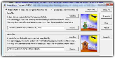 Để bắt đầu dấu file, bạn chọn tùy chọn Hide data in media and generate output file, click vào nút Browser đầu tiên để tìm đến dữ liệu cần che dấu. Tiếp theo, click vào Browser thứ 2 để chọn file media (file ảnh, file nhạc hoặc file video...) để làm “vỏ bọc bên ngoài”. Sau khi đã chọn xong, bạn nhấn vào Excute để bắt đầu quá trình “nguy trang”.