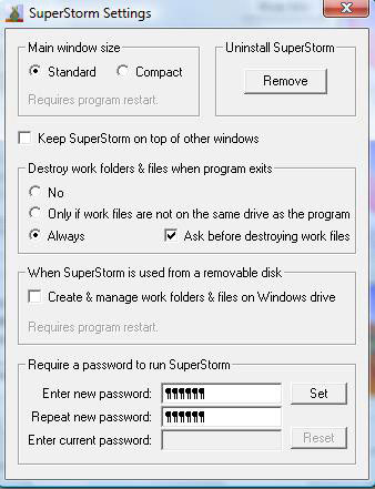 Để đặt mật khẩu hạn chế sử dụng Super Storm, tại giao diện chính, click vào Settings. Tại cửa sổ Settings hiện ra, bạn điền mật khẩu vào khung Enter new Password và xác nhận lại vào khung bên dưới, nhấn vào nút Set. Trong trường hợp muốn gỡ bỏ mật khẩu, điền mật khẩu đã khởi tạo vào khung Enter Current Password và nhấn vào Reset. Bây giờ, Super Storm chỉ có thể được kích hoạt nếu có được mật khẩu. Điều này đảm bảo rằng nếu ai đó phát hiện ra bí mật của bạn và muốn sử dụng chính chương trình để giải mã thì sẽ gặp đôi chút rắc rối.