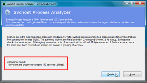 Trong lần đầu tiên khởi động, chương trình sẽ tự động quét toàn bộ các tiến trình đang chạy ngầm bên trong tập tin svchost.exe. Sau khi quét xong, kết quả sẽ hiển thị trên giao diện chính dưới dạng “A Warnings found, B svchost.exe proccesses contains C services”, trong đó A là số nhân tố độc hại mà chương trình nghi ngờ là virus hay malware, B là số tập tin svchost.exe đang chạy trên hệ thống, C là số dịch vụ đang hoạt động ngầm trên nền Windows. Để xem thông tin chi tiết, bạn nhấn nút Details.