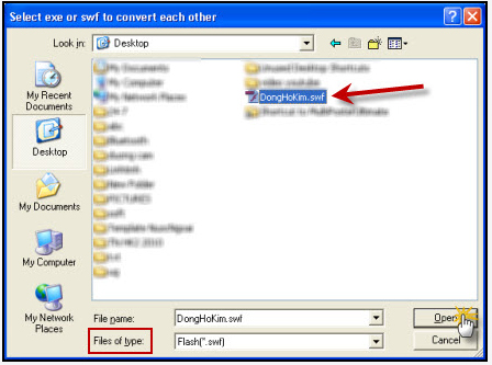 Nếu muốn chuyển từ định dạng .swf sang .exe thì ở mục Files of type chọn là Flash (*.swf), còn nếu chuyển từ .exe sang .swf thì chọn Flash (*.exe). Sau đó nhấp nút Open.