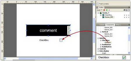 Trong danh sách xổ xuống, bạn nhấn đôi chuột vào để đưa thành phần đó ra cửa sổ làm việc. Ở khung này, bạn có thể thêm được: hiệu ứng động của banner theo chiều dọc (Vertical) hay chiều ngang (Horizontal), nhiều mẫu nút nhấn (Buttons), lịch (Date and Time), một số dạng thanh bảng chọn (Menu)…