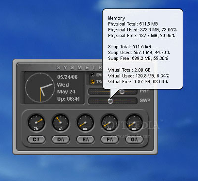 SysMetrix là một tiện ích giúp theo dõi hệ thống như RAM, bộ nhớ ảo, dung lượng các ổ đĩa, dung lượng hộp thư, thùng rác. Bạn còn có thể tùy chỉnh bộ nhớ RAM và bộ nhớ ảo bằng các nút trượt, làm cho nó trong suốt trên Desktop... và còn có cả một cái đồng hồ để xem giờ.