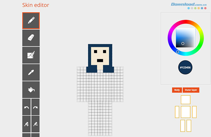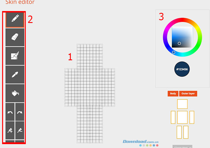 Khu vực 2: Những biểu tượng bên tay trái là các công cụ có thể sử dụng để tùy chỉnh và tạo skin cho nhân vật của riêng mình. Các công cụ này bao gồm bút, tẩy, sơn, phóng to, hoàn tác,...