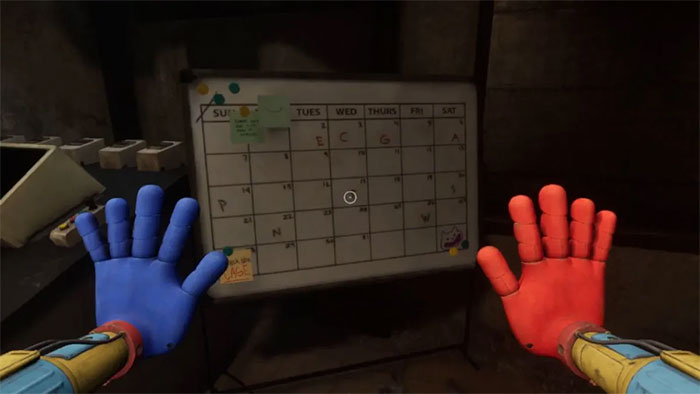Câu đố đầu tiên diễn ra ngay sau khi sống sót sau cuộc chạm trán với Nightmare Critter và Mini Huggy. Người chơi cần phải dọn sạch khói đỏ đã bao phủ Prison Block, vì ở trong đó quá lâu sẽ gây ra ảo giác và giết chết nhân vật do tiếp xúc lâu. Câu trả lời cho thử thách nằm trên tờ lịch trong căn phòng này. Gợi ý nằm trên tờ giấy nhớ màu vàng có chữ CAGE trên đó.