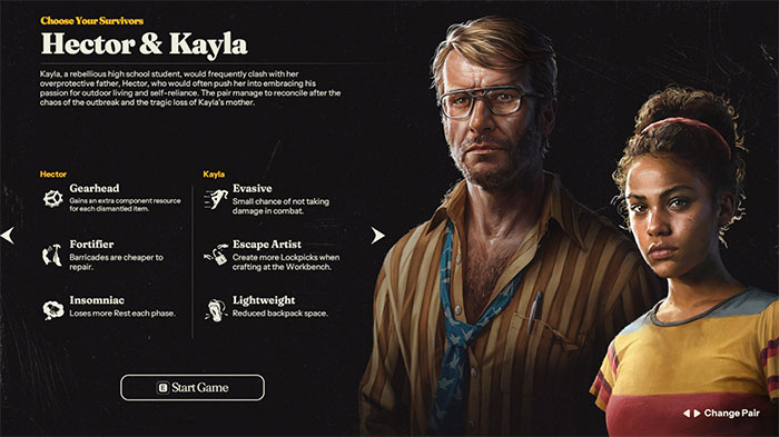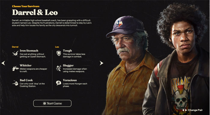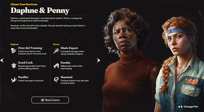 Trong Into the Dead: Our Darkest Days, người chơi không chỉ chọn một nhân vật duy nhất mà là một cặp đôi để bắt đầu. Mỗi cặp đều có kỹ năng riêng, điểm yếu, cùng những câu chuyện hậu trường phức tạp khiến trải nghiệm trở nên rất chân thực.