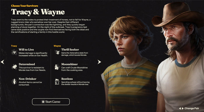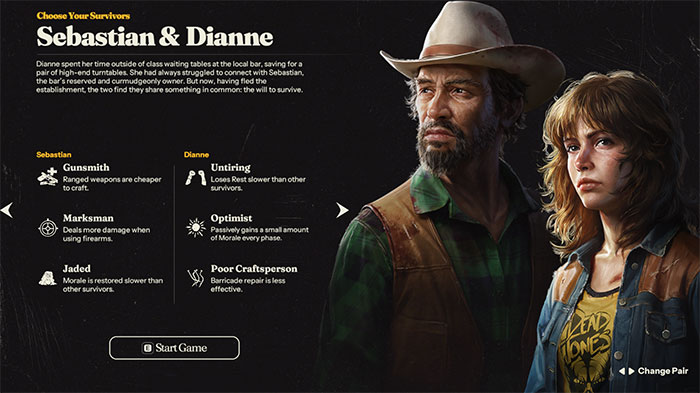 Mỗi cặp nhân vật trong Into the Dead: Our Darkest Days đều mang đến một sự cân bằng khác nhau giữa kỹ năng, nhược điểm và cả cảm xúc. Đôi khi họ mang đến cho người chơi nhiều hơn cả chỉ số: có khi là thức ăn, có khi là tổn thương tinh thần, và thỉnh thoảng là cả rượu moonshine.