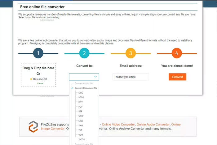 Để chuyển đổi tệp ODT mà không cần một trong các trình chỉnh sửa/ xem ODT được đề cập ở trên, tùy chọn tốt nhất là sử dụng Zamzar hoặc FileZigZag. Zamzar có thể lưu tệp ODT thành DOC, HTML, PNG, PS và TXT, trong khi FileZigZag hỗ trợ một số định dạng đó cũng như PDF, RTF, STW, OTT và các định dạng khác.