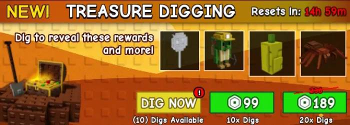 Cứ mỗi 5 phút, mọi người sẽ nhận thêm 1 lượt đào, tức là thêm một cơ hội để mở ô. Sự kiện sẽ làm mới mỗi ngày; tuy nhiên, nếu đã hoàn thành, người chơi vẫn có thể khởi động lại bằng cách trả 1 nghìn tỷ Sheckles hoặc 59 Robux.