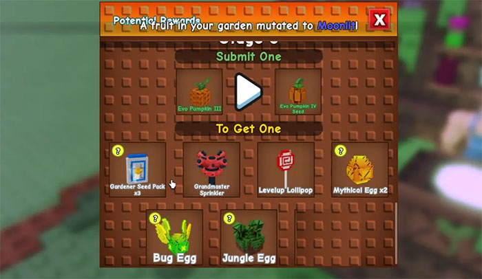 Trong sự kiện Seed Stages, người chơi cần mua Evo I seed từ cửa hàng hạt giống và trồng chúng. Sau khi thu hoạch, hãy mang cây đến NPC Seed Stage để nâng cấp.