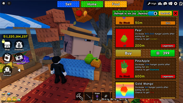 Người chơi có thể mua thức ăn theo 2 cách là đi bộ đến chỗ người bán thức ăn ở cuối bản đồ hoặc sử dụng tùy chọn Food ở đầu màn hình để dịch chuyển trực tiếp đến cửa hàng.