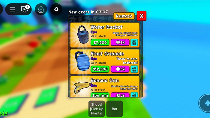 Plants vs Brainrots là một game Roblox kết hợp giữa sưu tầm nhân vật, thủ thành và mô phỏng trồng trọt. Trong trò chơi này, trang bị là những công cụ hữu ích hoạt động như vũ khí, vật phẩm hỗ trợ và bình thuốc cường hóa. Để hỗ trợ người chơi tương tác trong chế độ nhiều người và tăng cường phòng thủ trước Brainrot, người chơi có thể mua chúng tại Gear Shop, nơi được làm mới mỗi 5 phút.