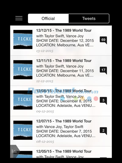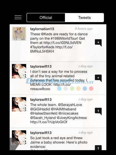 Nếu bạn muốn xem lại những video nhạc nổi tiếng của Taylor Swift, hãy truy cập mục Video gồm các video phát hành chính thức, video quay lại các show biểu diễn nổi tiếng... Bên cạnh đó, nếu bạn muốn tìm hiểu lịch trình tour diễn trong cả năm 2015 của cô ấy, mục Tour sẽ cung cấp đầy đủ những thông tin này!
