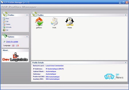 Mỗi profile bao gồm toàn bộ các thông số kết nối mạng như địa chỉ IP, Subnet Mask, Gateway, DNS. Nếu thường xuyên di chuyển đến các địa điểm kết nối Internet khác nhau, bạn cần phải thay đổi các thông số trên cho phù hợp với địa điểm đó. TCP Profiles Manager giúp bạn tạo ra nhiều profile kết nối Internet tương ứng với từng địa điểm, từng nhu cầu. Khi cần sử dụng profile nào, bạn chỉ việc nhấp chọn profile đó, không mất nhiều thời gian thiết lập lại.