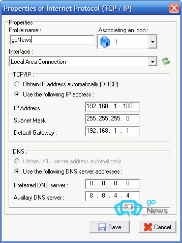 Tại giao diện chính, bạn nhấn New để tạo profile mới. Tiếp đó, bạn nhập tên profile vào ô Profile name và biểu tượng đại diện tại hộp Associating an icon bên cạnh, nhấp chuột vào mũi tên xổ xuống tại trường Interface và chọn card mạng cần sử dụng. Cuối cùng, bạn khai báo các thông số kết nối Internet vào hai trường TCP/IP và DNS phía dưới, rồi nhấn Save để lưu lại.