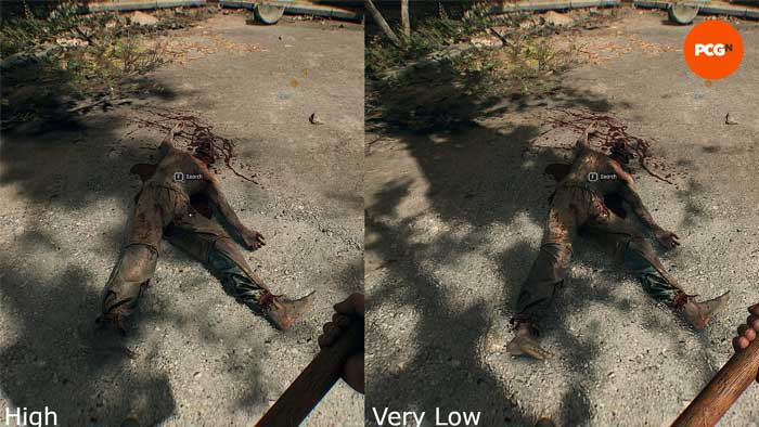 Điều bất ngờ là chất lượng hình ảnh giữa preset Very Low và High không khác biệt quá lớn nếu chỉ nhìn ảnh tĩnh. Khác biệt rõ nhất là ở chất lượng bóng đổ: ở thiết lập thấp, bóng trông gắt và vuông vức, trong khi ở mức cao thì mềm mại và chân thực hơn. Ngoài ra, ánh sáng và chất lượng texture cũng rõ nét hơn. Tuy nhiên, sự khác biệt đáng kể nhất nằm ở hiệu ứng khi chiến đấu và các phân đoạn di chuyển nhanh, parkour.