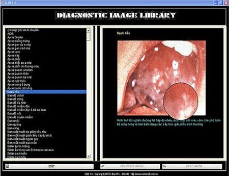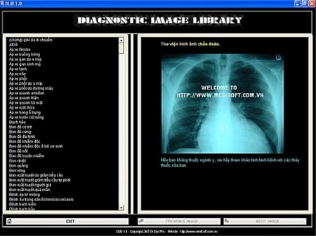 Thư viện hình ảnh chẩn đoán là phần mềm miễn phí cung cấp các hình ảnh hỗ trợ cho công tác chẩn đoán các bệnh thường gặp. Chương trình do BS Bảo Phi biên soạn gởi tặng các đồng nghiệp nhân dịp kỷ niệm 52 năm Ngày thầy thuốc Việt nam (27/02/1955 - 27/02/2007) .