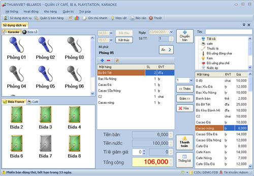 ThuanViet Billard là phần mềm quản lý hoạt động kinh doanh, được thiết kế đặc thù cho các lĩnh vực như Bida (Bi-a), Cafe, Karaoke, nhà nghỉ, với giao diện đơn giản và thao tác nhanh chóng, chính xác.