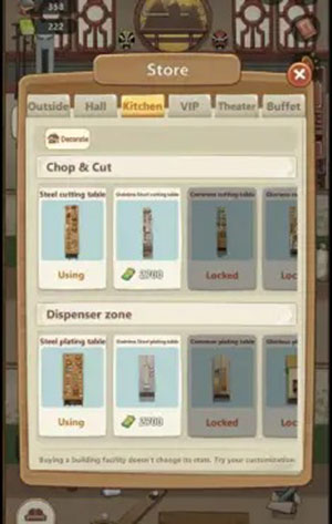 Sau khi quan tâm đến nhân viên, đã đến lúc bắt đầu mở rộng nhà hàng. Nhấn vào nút Cửa hàng ở dưới cùng bên trái, mua đồ nội thất mới và nâng cấp các phòng ăn hiện có của mình. Tùy thuộc vào những gì nâng cấp, nhà hàng sẽ nhận được bonus chỉ số như sau: