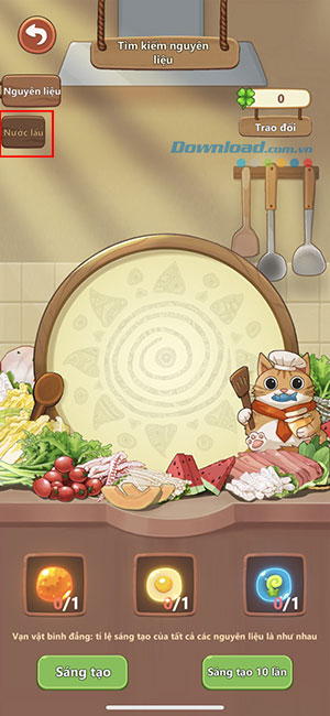 Ngoài việc sử dụng nguyên liệu,người chơi cũng có thể tạo ra một số loại nước dùng mới cho món lẩu của mình. Để sáng tạo nước lẩu, chạm vào Sáng tạo > Nước lẩu.