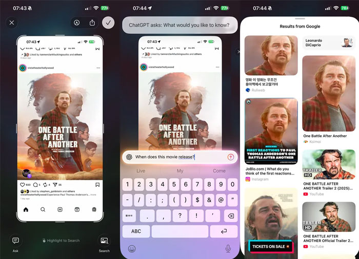 Ngay khi chụp màn hình, bạn có thể dùng Visual Intelligence để đặt câu hỏi hoặc tìm hình ảnh tương tự. iOS cũng gợi ý hành động như thêm sự kiện vào lịch hay mua sắm sản phẩm.